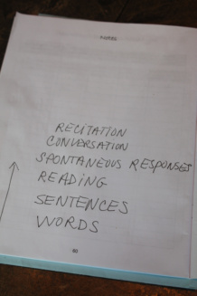 “We started out practicing saying words slowly and exaggeratedly.  Then we moved on to sentences and reading out loud.  Today we’ve been working on making sure that your responses to questions can be understood.  Next is conversation, and finally comes recitation.”