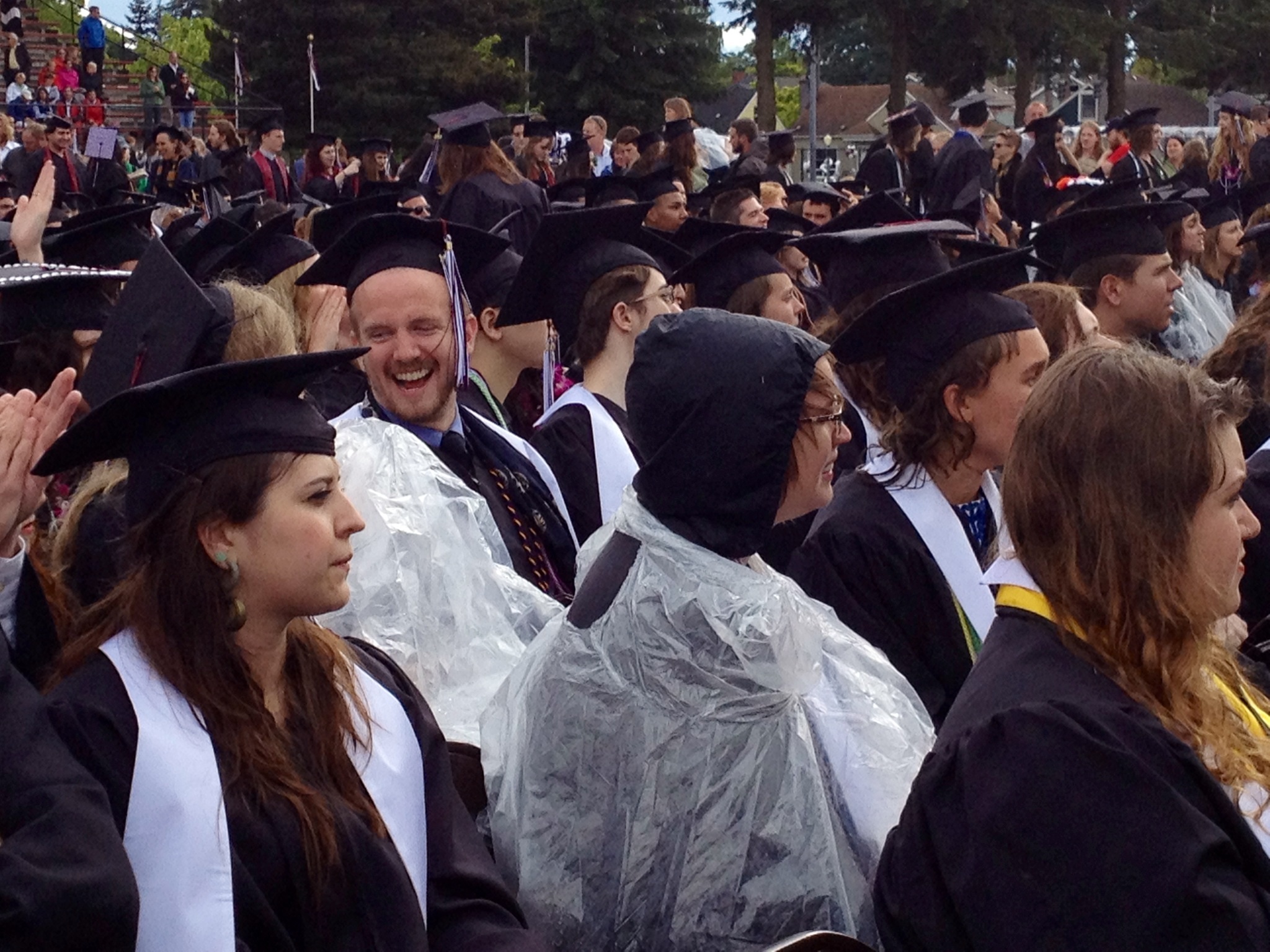 Water turned out to be the abiding symbol of the day. Rather than the typical, somewhat overly long commencement ceremony, in which one waited for one name out of more than 600, Yahweh (for it had to be the angry God of old) decided to interrupt things with an outburst of Biblical proportions.