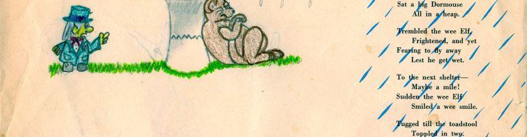 I remember sitting at our dining room table with an activity book of children’s rhymes when I was about six. On the right side of the page was a poem about a wee elf who seeks shelter from the rain under a toadstool, only to discover that a big dormouse already occupies it. The left side of the page was left blank for the picture that would come from a child’s imagination.