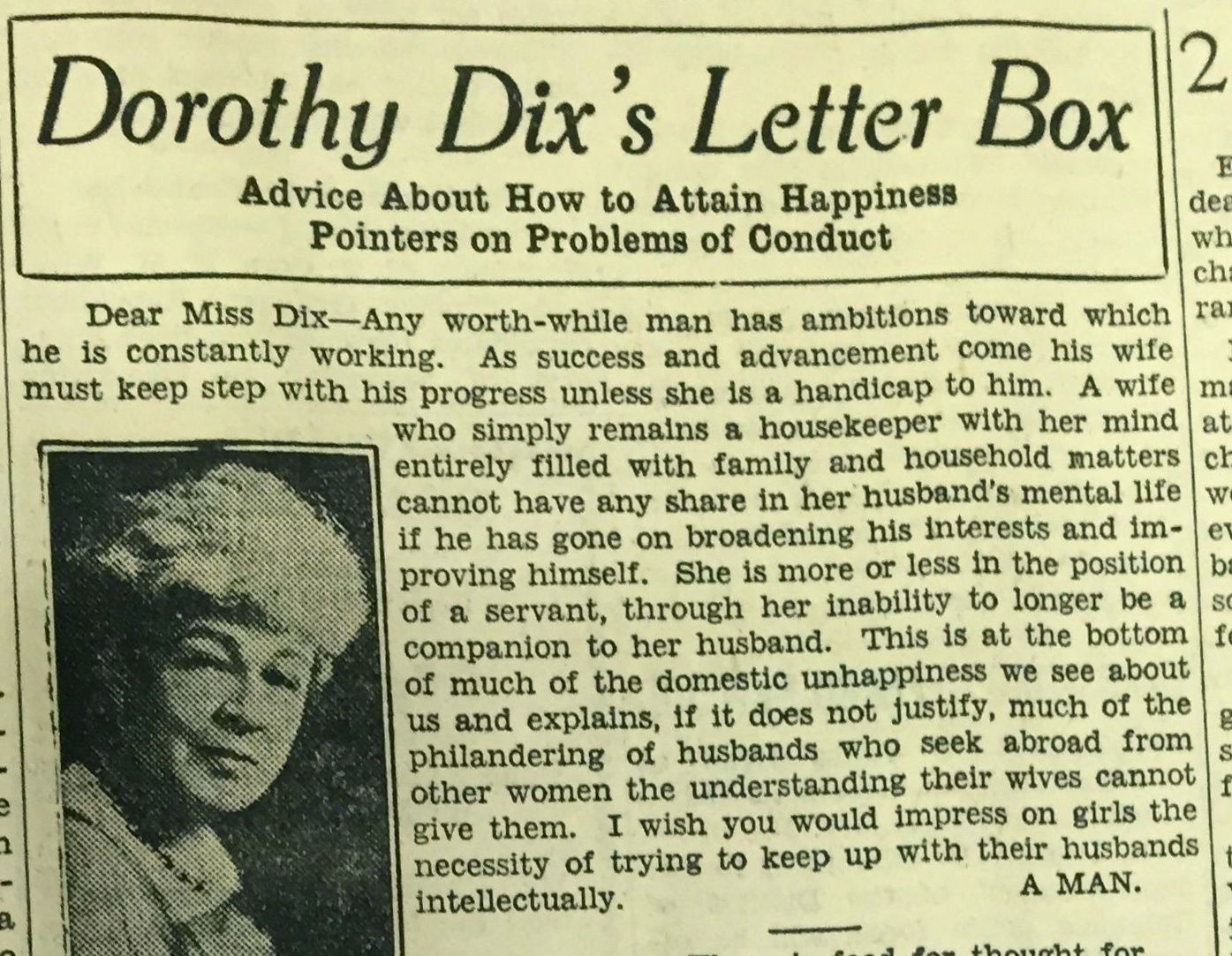 You think the contemporary generation gets truckloads of advice? Before social media, women of my grandmother’s era had advice coming at them from all sides — family, busybodies and the newspaper. The Yakima Daily Republic was among hundreds of papers that printed syndicated columns by Dorothy Dix, the forerunner of “Dear Abby,” beginning in 1923. Under the Dix pseudonym, Elizabeth Meriwether Gilmer also published How to Win and Hold a Husband in 1939.